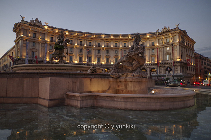 告别罗马前的闲逛也能带来惊喜。罗马的共和国广场建于1885年,也称“埃塞得拉广场”,意思“古罗马的会议堂”。广场中央是奈亚迪喷泉由马里奥•鲁泰利1901年完成。四方各一位女神和动物石雕像,喷泉中央一位壮男手举一条大鱼,鱼嘴里喷出一束高高的水柱,水花飞溅四周和女神的身上,这座男人塑像是1911年加上去的,象征人类战胜大自然的力量。