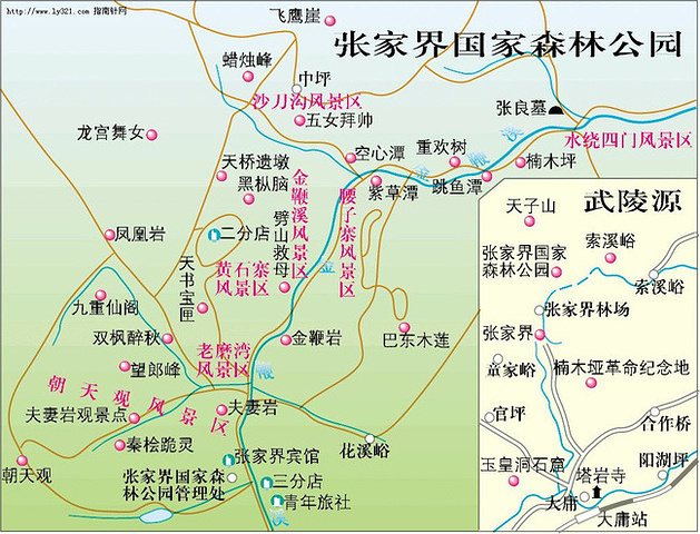 张家界是湖南一个旅游地级市,两区两县(永定区,武陵源区,桑植县和慈利县)总人口168万多人,32个民族,其中土家族70%,位于湖南西北部,属武陵山脉腹地。张家界的旅游资源非常丰富,景区共有四大景区:武陵源风景区,永定区的天门上风景区,慈利县的张家界大峡谷和桑植县的贺龙故居及红二方面军长征出发地。其中以武陵源风景区为主,武陵源风景名胜区又分为四个景区:张家界国家森林公园,杨家界自然保护区,天子山自然保护区,索溪峪自然保护区。张家界国家森林公园是中国第一个国家森林公园,景区集神奇、钟秀、雄浑、原始、清新于一体,以岩称奇。园内连绵重叠着数以千计的石峰,奇峰陡峭嵯峨,千姿百态,或孤峰独秀,或群峰相依,造型完美,形神兼备。张家界被称为地球上“扩大的盆景,缩小的仙境”和“动物的王国,植物的基因库”。属于《世界首批自然遗产》、《世界首批地质公园》及《国家五A级风景区》。