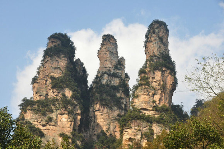 三姐妹峰位于十里画廊峡谷最深处,是十里画廊的精华景点之一。从南天门向对面望去,可见三座瘦削石峰,形如美女,婷婷玉立,故名“三姐妹峰”。从天子山下到十里画廊,首先看到的景点就是三姐妹峰。三姐妹峰尤以第三峰奇妙,于石峰胸部有一直径约1米乳眼, 由孔中可窥山后天光,既像高悬在石壁上的明镜,又像少女佩带着一枚晶莹透明的玉饰。三姐妹峰--大姐抱着孩子,二姐背着孩子,小妹肚子里怀着个小宝宝,你看出来了吗?