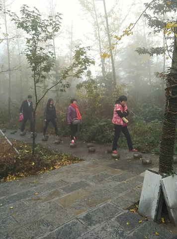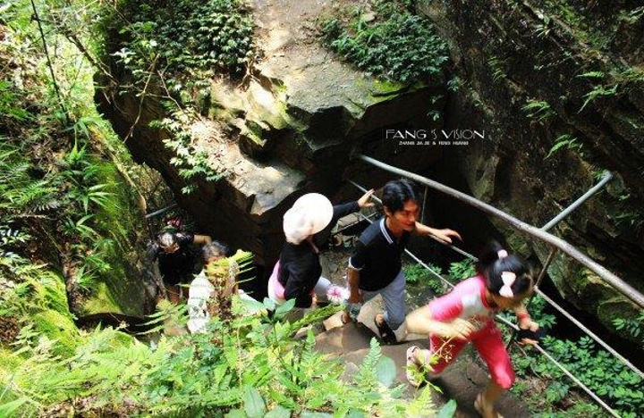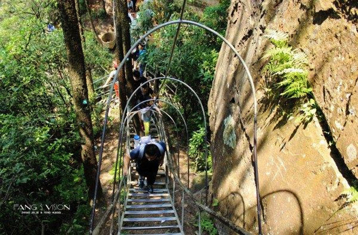 胆战心惊地过了左右摇摆的索桥,眼角的余光扫了身旁两侧深不见底的悬崖和山谷,脚都有些不由自主地开始打颤。走过索桥,面前便是两架垂直90度的登山扶梯,真是一波未平一波又起,这回眼睛都不敢往下瞄,一鼓作气爬到了天波府观景台。
