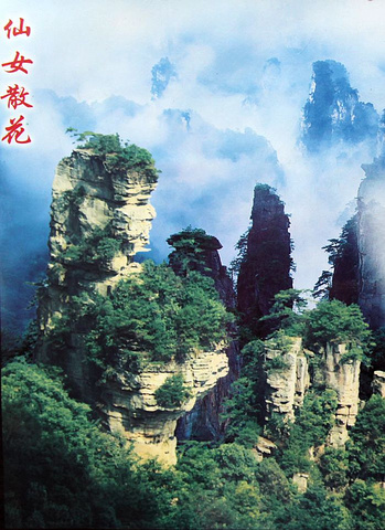 出天子山贺龙公园大门东行不远,正前方有三层峰群。其中一峰侧面似少女,手捧花篮,面东而立,眉目清秀,线条分明,体态娇娜。峰顶青松灌木似少女头上的装饰。整个造型优美逼真,韵致殷然。它是天子山上的第一大精华景点。仙女献花坐落于御笔峰斜对面。石峰俏立云端,态极妖娆,岩顶灌木滴翠,山脚山腰野花如锦,每到春暮,天风吹,流云飘,恍如仙女将鲜花撒向人间。