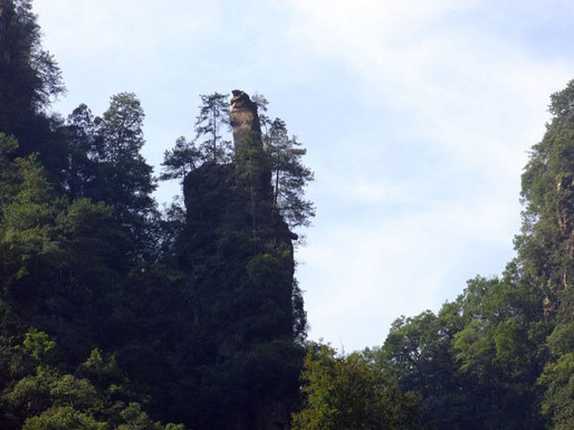 溪流对岸有一根孤立细小的石峰,将石峰下面的整体连起来看,就好像一只右手四指弯曲握紧,独独伸出食指,此峰叫“食指峰”,又叫“一指峰”。换个角度仔细看,这根“食指”的指节轮廓特别分明,指甲尖尖细细,十分形象。