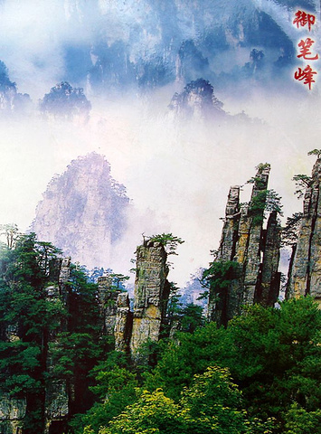 御笔峰坐落于天子山自然保护区,是天子山风景区的最佳景点之一。御笔峰是并列的三座石峰,高低不一,峰顶长有松树,极象几枝倒插的毛笔。传说这是向王天子的“御用笔”,故名御笔峰。峰高100余米,数峰参差并列,这里云缠雾绕,似沉似浮,人称“琼山仙阁”。御笔峰(据说是明朝时期土家人的领袖向王天子兵败时丢弃的御笔所化成的山峰,不管你信不信,这只是个传说)御笔峰被公认为是武陵源砂岩大峰林风光的标志景点,不断出现在海内外各种媒体和宣传品上面,堪称天下一绝,可谓神来之笔。