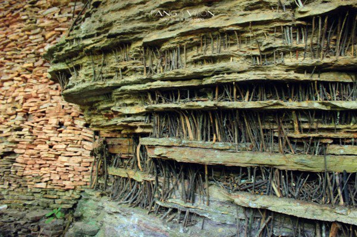 乌龙寨后四面皆为断壁深崖,不远处有一孤石鹤立群山,这便是深藏闺中的奇景--天波府。去天波府需要走过晃晃悠悠的索桥,攀上垂直90度的悬梯才能到达天波府山顶,天波府下有很多座石墙,皆相对平行而立,高矮参差不齐,气势恢宏万般景物尽收眼底。