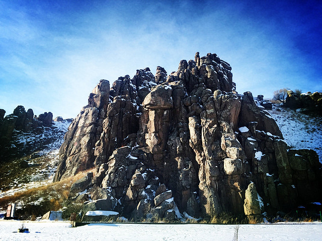 吃完饭下午就是赶路,赶路,赶路。。。。。。今天的路况是各种颠啊,然而温暖的太阳又晒进车里,照的我们昏昏欲睡,所以这一路我们时而打盹儿,时而又被颠醒。下午本来比较期待的是一个叫玫瑰峰的景点。那是一处由十余座石峰组成的山石景区,因石峰大部份呈红褐色,因此得名“玫瑰峰”,当我在拍玫瑰峰的时候,发现老公和扬扬都不见了,原来他们跑到了马路对面,那边才是真正属于我们的开心乐园。