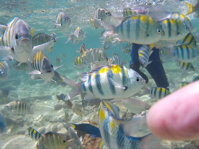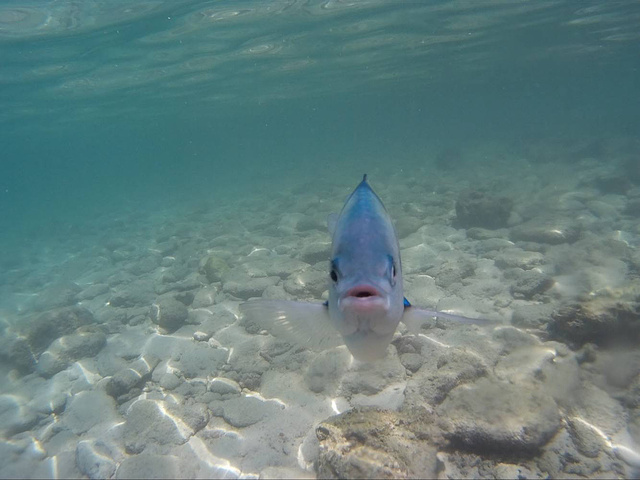 这边的海滩都是小石头,没有什么沙,但岸边就有好多鱼,鱼儿们都想很贪吃,面包一撒进去就马上抢完了。