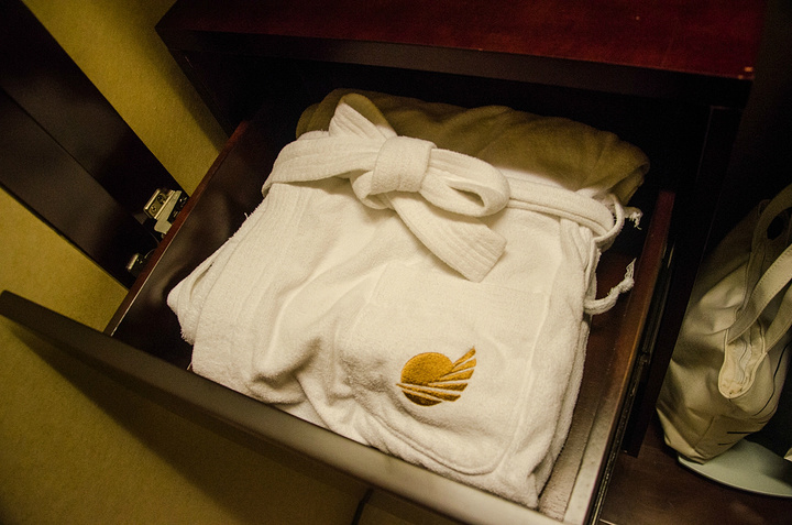 浴衣不是悬挂在卫生间的,而是放在衣柜的抽屉里面的,注意打开抽屉,否则会找不到浴衣。