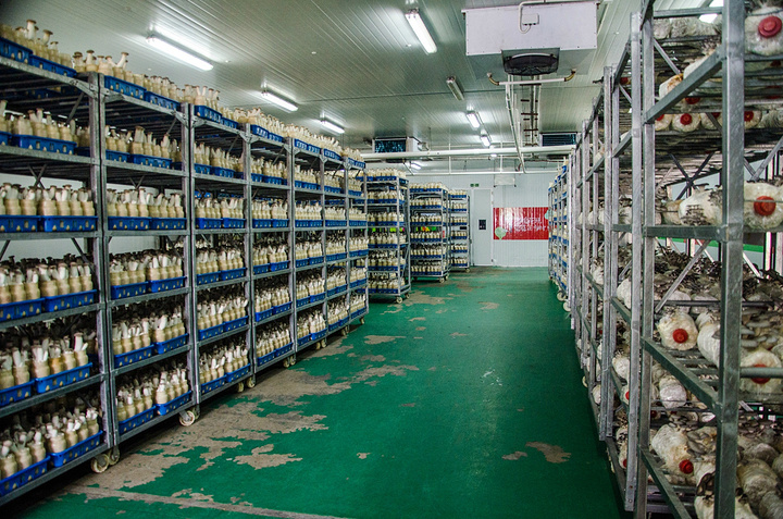这是低温食用菌培养厂库区域,进入期间整个温度很低,为香菇的人工栽培提供了必要条件。