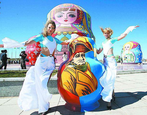 套娃广场感觉就像一个童话世界。相传在俄罗斯有一个小男孩放牧时,不小心领丢了自己的妹妹,他因为想念自己的妹妹,就照自己妹妹的模样刻了一个小木头娃娃,一直带在身上,过了两年,他想自己的妹妹应该长大了,长得更漂亮更美丽了,于是又刻了一个稍微大一点的木头娃娃,就这样,一直过了十多年,这个小男孩长成了一个英俊的小伙子,身上一直带着七个大小不同的木头娃娃,然后他把大娃娃掏空,把小娃娃装到里面,以后每当他想起妹妹的时候,就把他们一个个打开来看。这个故事在俄罗斯民间流传了很久,所以套娃便成了俄罗斯最传统的一种工艺品。