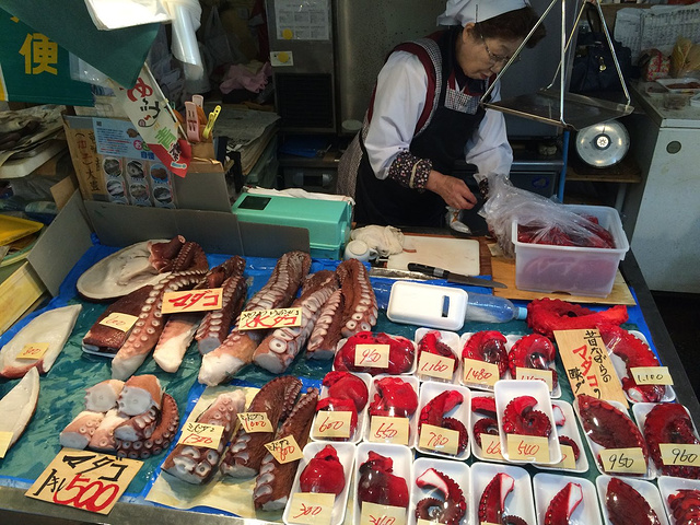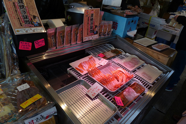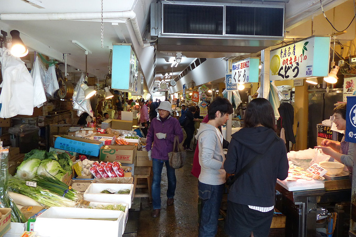 热闹的市场内,有海鲜也有蔬菜肉类。日本的水产市场都非常干净,不像国内总是污水横流的样子。