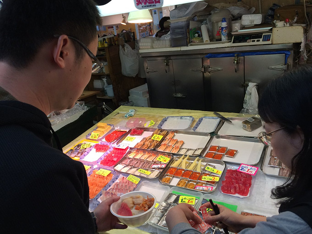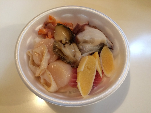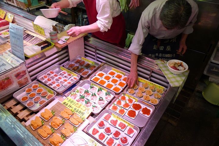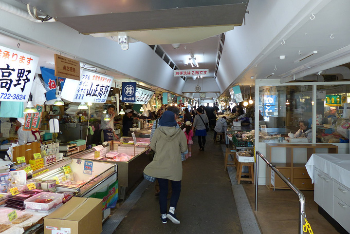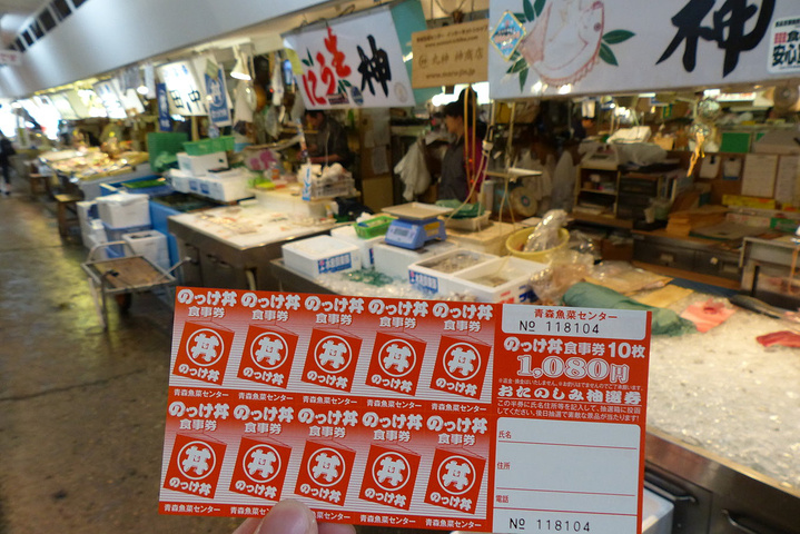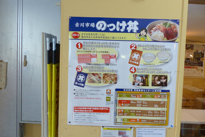 古川市场正式名称为青森鱼菜中心,最有名的就是自制海鲜饭了,花1080円买了餐券后,就可以到各个摊位挑选海鲜,搭配出自己喜欢的海鲜饭。