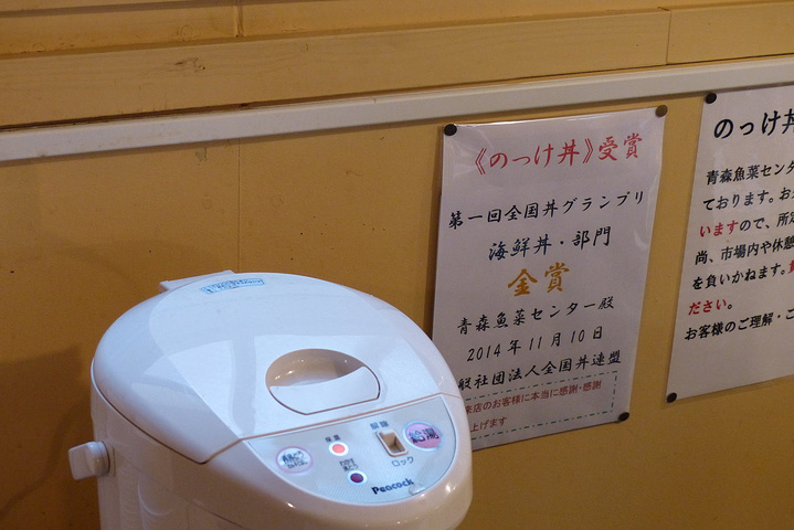 茶水壶。可以自己接水,旁边的奖状,青森鱼菜中心的海鲜饭是全国海鲜饭金奖