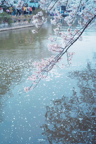 湖面上飘着樱花瓣