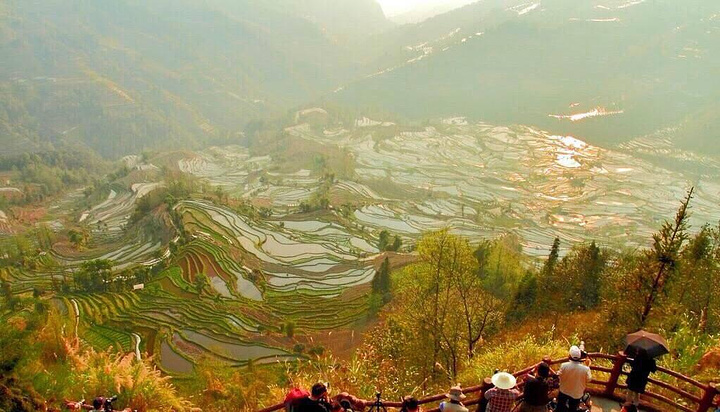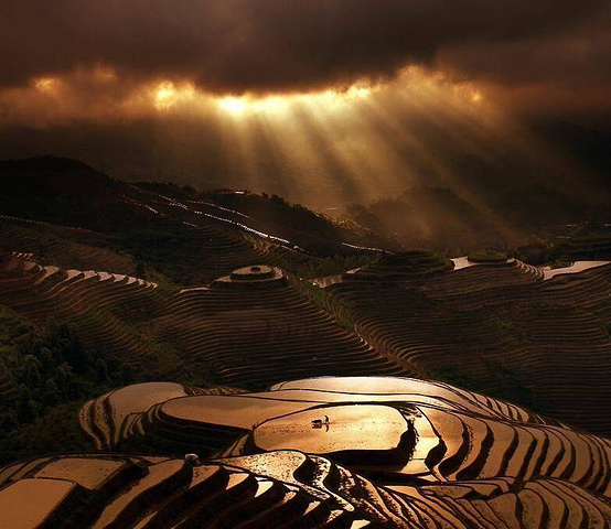 太阳完全出来以后,梯田的美景尽收眼底,像雪?像水?像层层叠叠的积木?倒不如说它像一幅画,一副美景图。优美的曲线,或平行或交叉,是当地人民用自己的劳动智慧勾勒出来的图画。