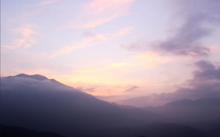 太阳从地平线升起后,天空还是变成粉色,如青春的女孩,脸上露出害羞的粉。