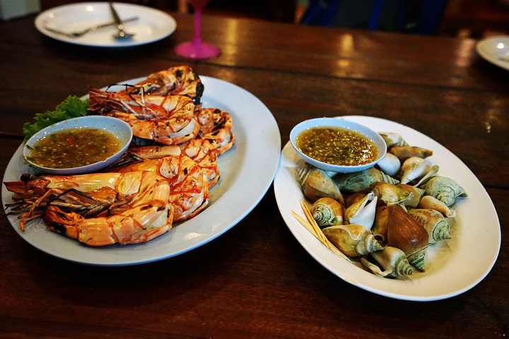 晚餐,照例是大家都喜欢吃的海鲜、沙拉、果汁。走过很多国家,泰国菜算是最对我们胃口的美食之一。丰富、新鲜、爽口,仿佛吃几个月也吃不够,一点都不担心没得吃。