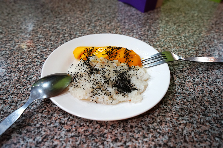 吃完之后,意犹未尽。我们又跑到隔壁的小餐馆点了一份泰国名小吃:芒果糯米饭