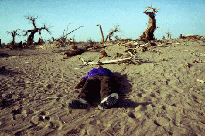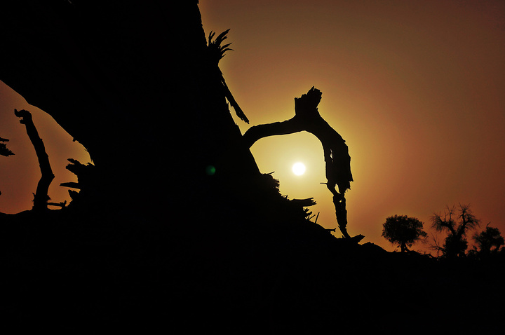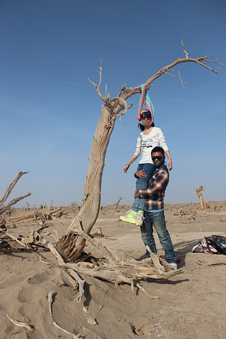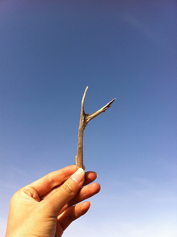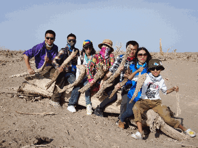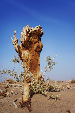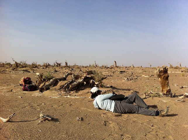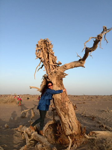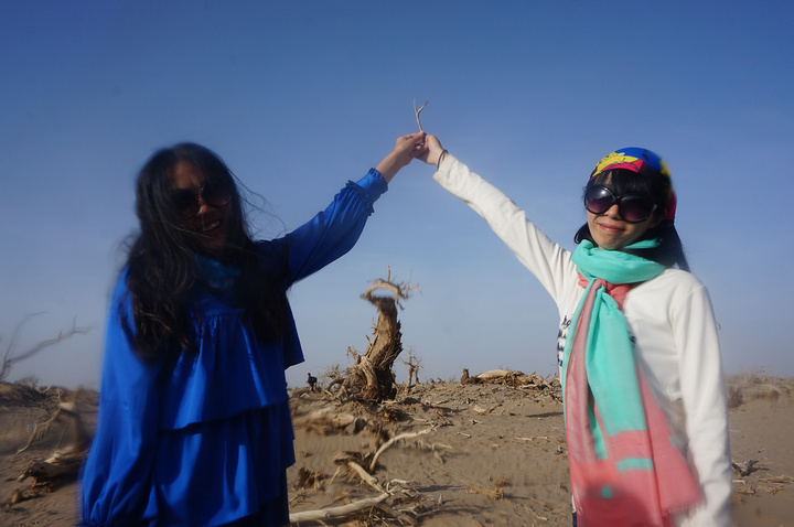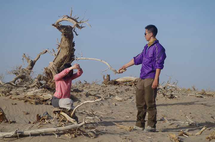 我在沙漠里找到了小树丫、大树丫,跟小丫子拿着合影留念,我至今都后悔没将那个小丫带回来,深深的遗憾,幸好还有照片。与小初一起将两块枯木十字交叉起来,当成跷跷板,童趣无限。一阵疯狂之后,原生质带领着大表哥和启鹏去门口买哈密瓜,我们找到了一棵拍摄日出最好的枯树坐着等他们,将小表妹的围巾挂在树上作为标志,可是他们迟迟都未归,电话信号很不好,找了好一阵才找到,丝毫没有看到挂在树上的围巾。