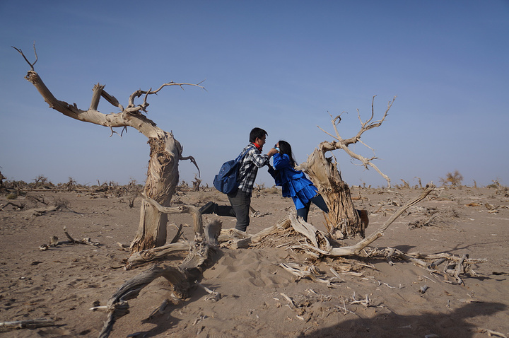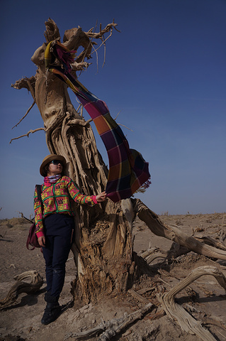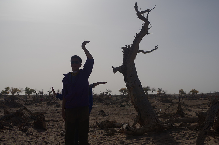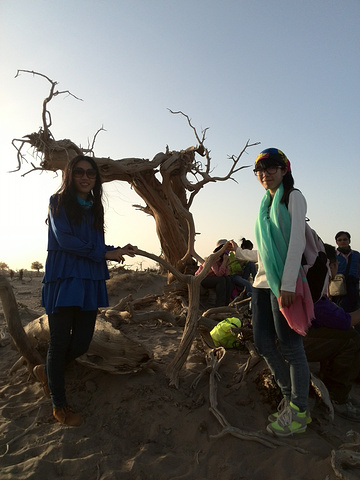 四点左右,我们从黑水城坐车到怪树林,正好可以在怪树林看日落。怪树林因为枯木形态各异、奇形怪状而得名,百度上告诉我们这里曾是一片茂密的胡杨林,后来因为河水改道,水源断绝而枯死的。“这里是在黑水河附近,我估计以前黑水河是流经这里的,现在改道跑到了我们露营那边。”楼告诉我们她的猜测,有理有据。胡杨一千年不死,死了一千年不倒,倒了一千年不朽,遍野都是枯死的胡杨,透着恐怖的气氛。