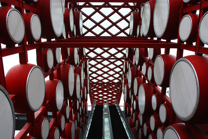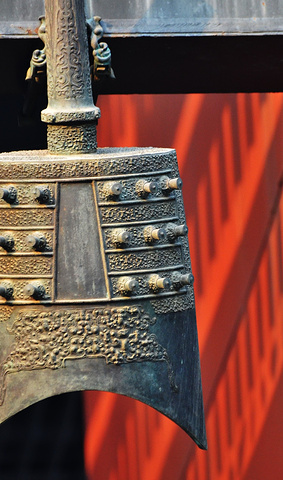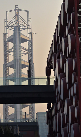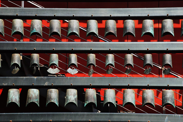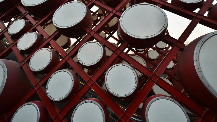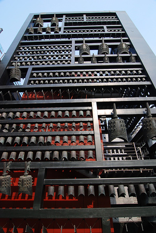 礼乐重门院子东侧是龙形水系下面的地下商业,西侧是地铁奥运支线及部分商业空间,南北两端与前后院子相通,是一个过渡性的空间。这里有红墙,有红色钢构支起的上百面“响鼓”。鼓面可敲,鼓内藏灯,白天是鼓,晚上是灯,鼓灯结合为奥运搭起喜庆的红门。 这里还在甬路旁立起一排“铜萧”,管上有空,风过可鸣,管下有灯,引导路人。这里还搭建了钟楼,是在钢架上挂满礼乐的钟磐铃,随风摇摆,清音可绕。此外,窗前还拉起了细索,如琴弦般可以拨动,弦下的发生器便会送出美妙的音符,通过人为的敲击和流动的风,钟和着磐鸣、鼓随着箫吟。