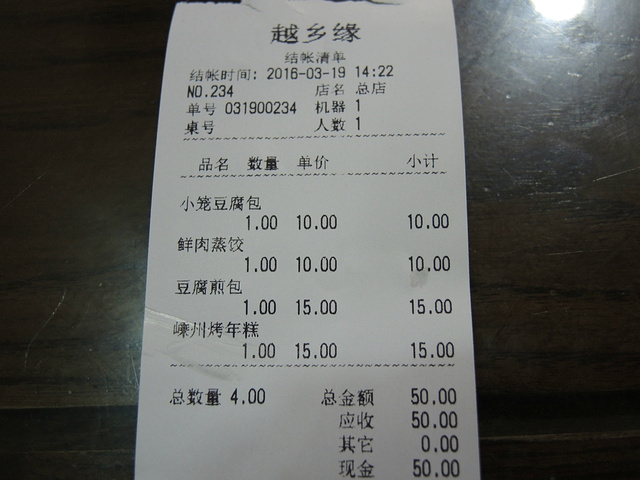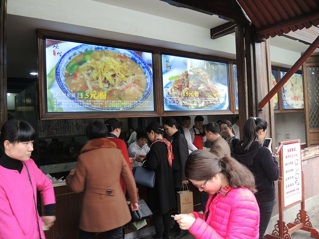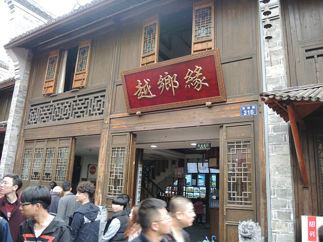 南塘老街里大多是饭馆食肆,满街里漂浮着各种食物的味道,有鲜香的,也有异臭的,繁杂得很。说来也奇怪,刚才还服服帖帖的肚子,此刻却突然不甘寂寞地咕噜咕噜地学起青蛙叫了。“民以食为天”,废话少说,赶紧找地方吃饭吧。计划里的用餐地点是“贴阁碧”,就在街口不远处,很好找,可惜饭点已过,人家关门休息了!难掩的失望立刻挂在了喵喵的脸上!大餐吃不着,那就只好随便找点吃的对付一下了。旁边的一家“越乡缘”里的食客还很多,于是我们就近选择了他家。进门落座,年轻人去点餐。他家都是宁波小吃,我们选择了四款先喂喂饥饿的肚子,相信这条美食街里会有很多美味等着我们呢,留点空间给后面的好东东吧。