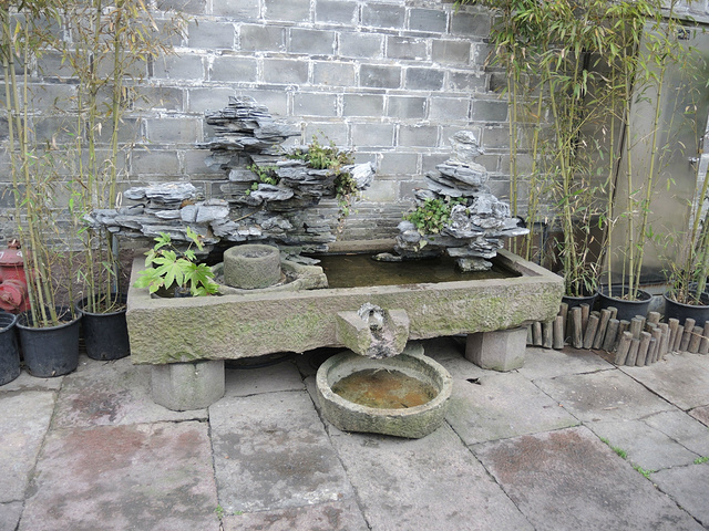 街里的摆设装饰都颇具江南风格:石磨。假山,修竹,流水。