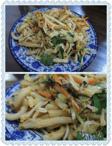 烤年糕,看着和北京的素炒饼似的,也是韭菜、豆芽、胡萝卜丝为配料,只不过主料不是烙饼丝儿,而是年糕条。江米粉做成年糕黏糊又有韧劲,吃起来颇需要咬劲儿,糯糯韧韧的,口感很新奇舒爽。吃起来感觉明明是炒制而成的,却叫“烤年糕”,不知何故。如果真的是烤制的,哪能这么软糯劲道,还不烤得焦糊梆硬呀?!总体感觉“烤年糕”挺好吃的,风卷残云,一丝不剩。