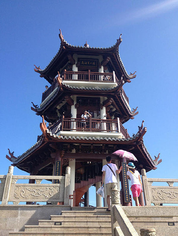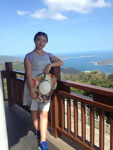 走了一小会儿后,决定乘坐观光车直接到山顶。有个楼亭可以上去,眺望天际,看到的但是海岸线与天际交汇融合,满眼的温暖蓝色系,美不胜收,加上微风吹拂,此刻只想有张床,美美的闭目养神!既然没有床,那也不用辜负这般风景,美美的和大自然来张合照吧。