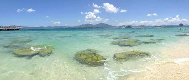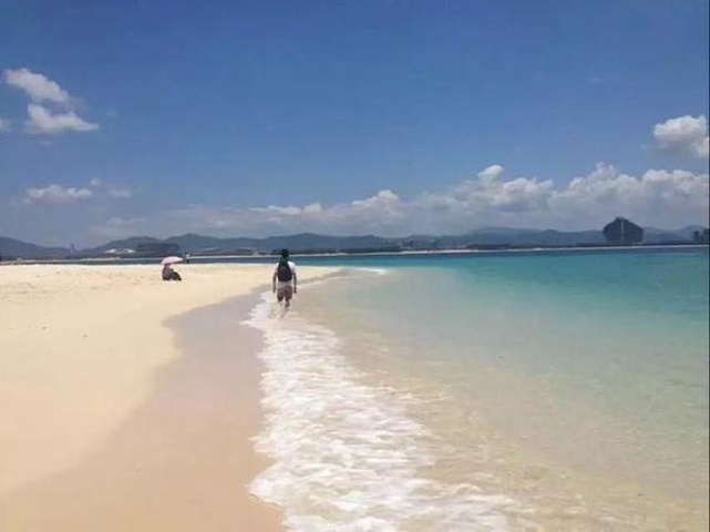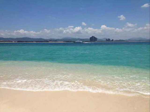 绝对必去之地。经过深思熟虑,我们报了个团,就是包来回车以及门票。出发时间比约定时间晚了一点点。导游有点强制消费,在上岛前一直让我们购买岛上游乐项目,比如潜水、水上摩托等门票,对于不配合的游客不发票,除我们两个还有其他两个女生外基本都买了,我们直接问他要票,很不情愿的给了我们。坐船约10分钟上了岛。上岛前就已经开始有点小兴奋,因为看到海水很清澈,视觉也很广阔,上了岛之后整个人简直就疯了!也太美了吧!!!!霸占整个视觉的便是这清澈的海水以及干净的蓝天,真正的碧海蓝天,纯净的不像话!!由近到远,海水颜色由浅至深,再没有比大自然更好的美术家了,最难能可贵的还是那一抹清澈。二话不说,撒开了腿就往海里奔,各种跳跃,各种奔跑,各种惊叹,还好我小伙伴还有一丝理智,告诉我别停留在这一个地方,前面还有好远,于是我就这么乐颠乐颠的慢悠悠的往前走。走了好久都仍在这一片美丽中。后来来到了可以游泳的地方,我小伙伴说紫外线太强,死活不肯下海,一个人擦了三层防晒乳,打把伞默默地坐在沙滩上玩手机。我无暇也懒得管他,直接换了泳衣(有免费更衣室)就直奔大海怀抱了。虽然太阳很大,天气很热,但是海水却是凉到骨头里,冷不丁全身下海打了个激灵。但慢慢适应后就是被温柔海水裹挟的舒服了。也不敢去深海,在浅海游,大概1米多深,底部也是可以看得清清楚楚,旁边有妈妈给小孩捉贝壳呢!就这样,我游了两个小时,我小伙伴维持同一姿势坐了两个小时。等我一上岸,他撇了我一眼后就笑得不能自持了,后来去照镜子才发现我已经黑得发亮了!!!