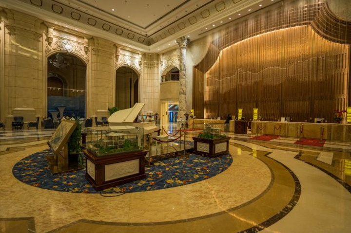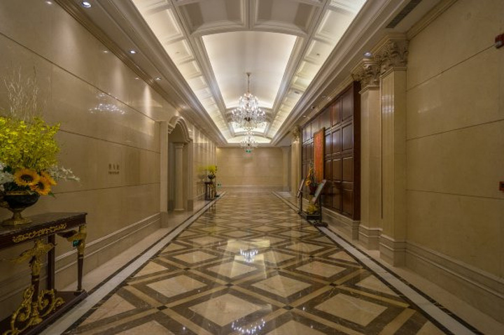 房间的装修风格以欧式宫廷风为主,巨大的支型灯池,复古的罗马柱,大面积的使用大理石和水晶的奢华元素,在如此气派的大厅就可见一斑。