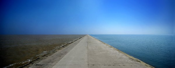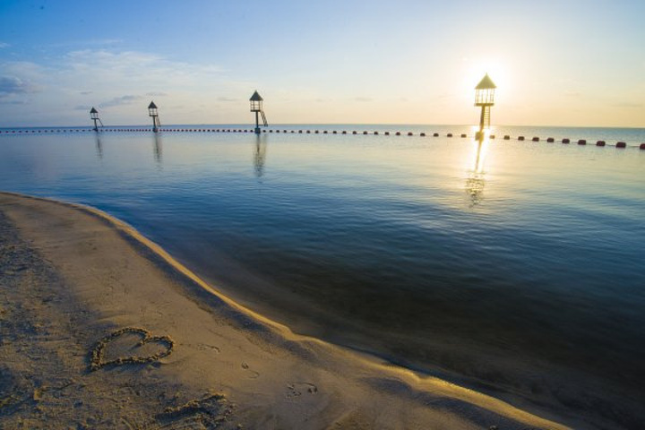 从酒店瞭望,发现这是一湾水波不兴的碧海。再远望,天际线边是一圈若隐若现的防波堤,将整个人工半岛与烟波浩渺的大海隔绝,再加上专门的滤沙净水设备,才有了这一片热带风情的碧海银沙,真可谓工程浩大。如果沿堤坝骑行,就可以领略“双色海”的奇观:外侧是黄灰色的惊涛海浪,内侧是碧蓝色的宁静海湾。