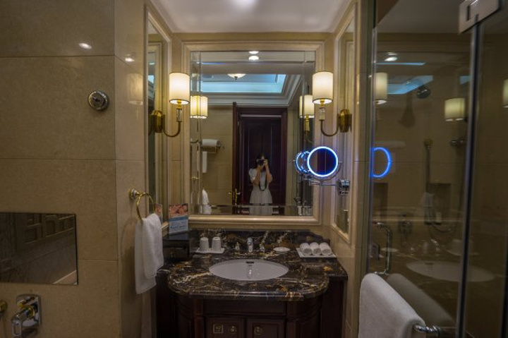 浴室的面积也很宽敞,完全做到了干湿分离。在浴缸一侧的墙壁上还有一块电子显示屏,在享受泡澡的同时,也可以欣赏到酒店漂亮的风景,和优美的配乐。
