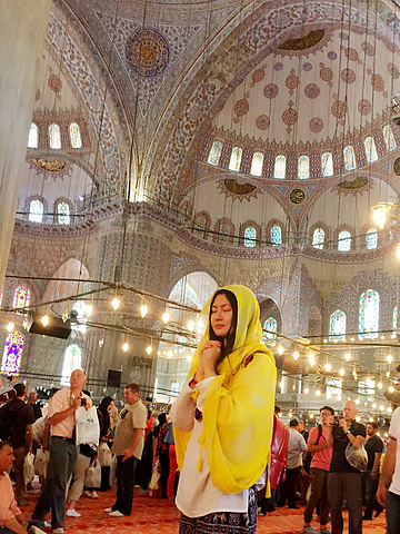 蓝色清真寺号称伊斯坦布尔的地标式建筑,应该是游客必逛景点吧,地处旧市街的中心,始建于1609年奥斯曼帝国时期,花费了七年时间建成,气势恢宏,造型奢华独特,是世界十大奇景之一。免费参观,人多得不行,只能脱鞋进入,在这里,你会很荣幸的闻到来自世界各地的臭脚丫味儿(~ ̄▽ ̄)~ ,那香醇~~我也是醉了~~(~ ̄▽ ̄)~里面的人实在太多,感觉也不太好拍照,手机无能,拍出来的照片没有想象中的好,虽然在很多游记中见过无数次它的容颜,但亲眼所见,还是觉得很震撼(当然,如果没有臭脚丫味那就更好了 z Z= ̄ω ̄=