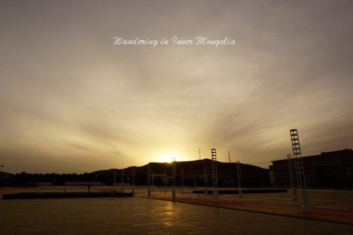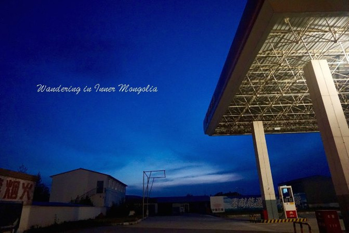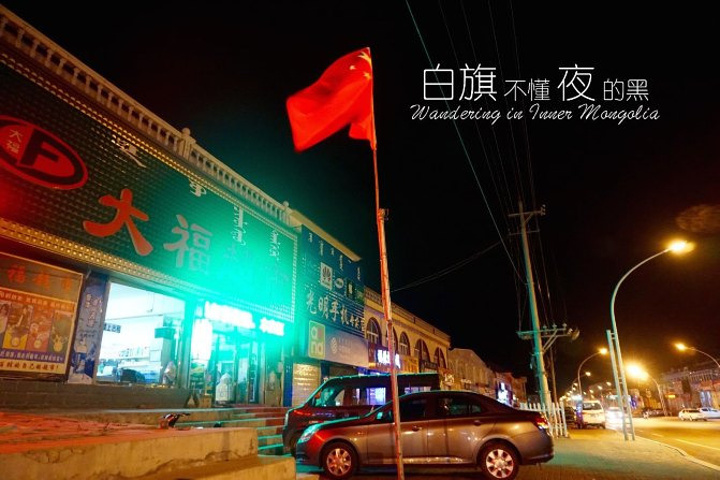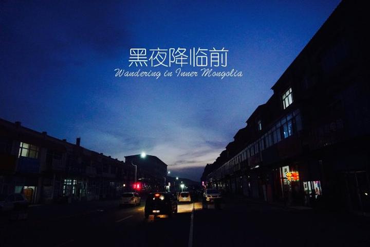 而后,夜幕开始降临,我沿着省道308,步行前往明安图镇。黑夜降临前的白旗街景显得非常震撼。