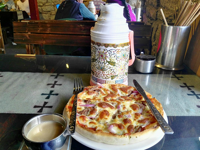两磅的甜茶和一个披萨。老实说这个甜茶喝第一口的时候感觉完全和在玛吉阿米和的味道不一样,玛吉阿米的味道偏淡容易让人接受,而这家的甜茶就种浓浓的酥油味道,我有点接受不了。可是接下来再和反而越来越顺口了。甜茶馆是个神奇的地方,拉票和藏熬们的日常生活据说都是从一杯甜茶开始,在这里我很荣幸的认识了几个好朋友,格桑、西葫芦、木木等,他们里面有拉漂也有藏熬,都是从大城市逃离到西藏拉萨来的,我们在一起完全就是那种我有茶你有故事吗的感觉,从他们的故事里我明白也懂得了很多。我很喜欢这种人与人之间的友善和热情,它不会那么冷漠,宛如一股暖心的清泉水滋润着我的心灵,这是一种在城市里完全体会不到的感觉。