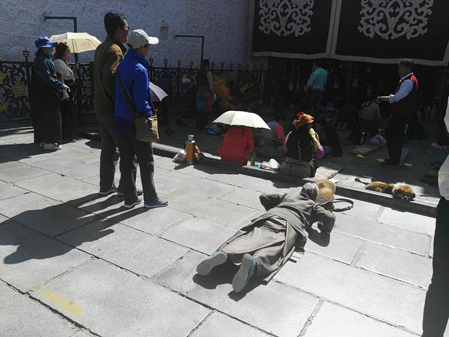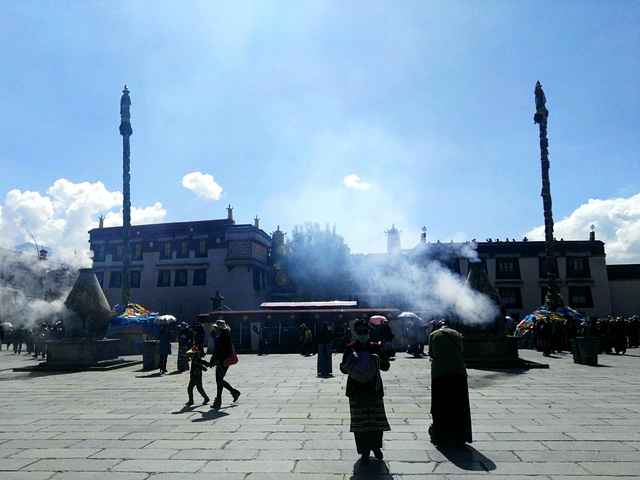 在拉萨的这些天大昭寺广场我几乎都是下午以后才去,第一次这么早来这里,只见广场上两个大香炉里的藏香缓缓升起着燃烧后的青烟。来自四面八方的藏族同胞,或转经筒、或三步一叩拜、或口念六字真言在做着每天的转经功课。