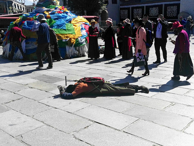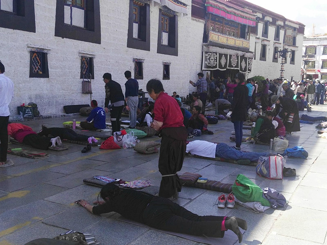 藏族信徒的一生中以磕满十万零八百个长头为圆满,为此很多人不惜牺牲自己的生命。
