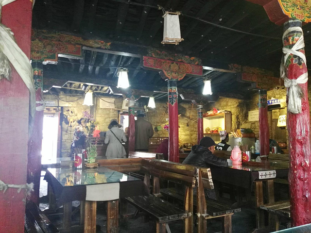 吃过了酸奶看到对面有一家喜鹊阁厨房,打算中饭就在这里解决。由于还不到拉萨人民的用餐时间,店里的人还不是很多我就选择了一个靠窗子的位置坐下。