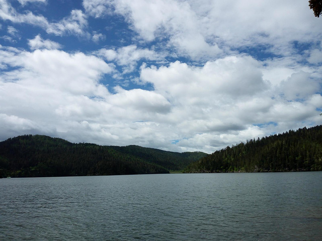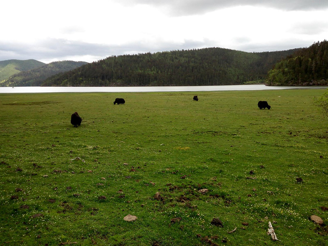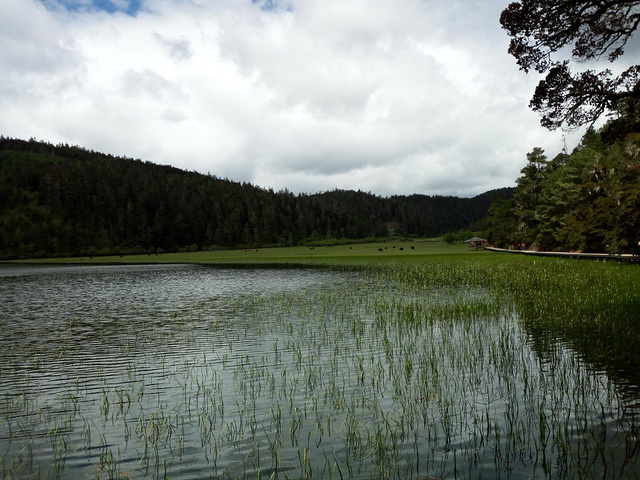 普达措内当地牧民仍然可以在里面放牧,所以可以看到很多牛,远处看都是黑点点只有近了才能看出是牛,还可以看到牛粪的,真的很原生态。