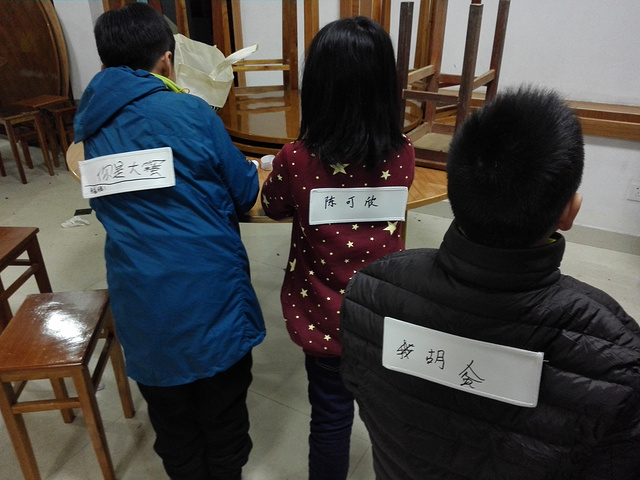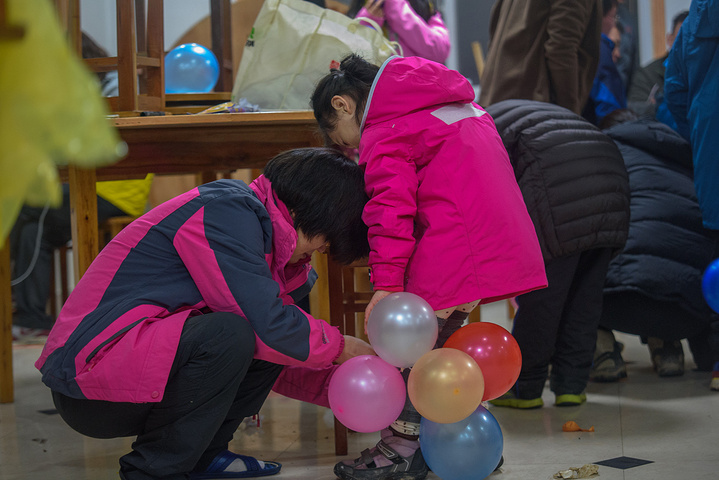 美美的一顿晚饭,吹干换好干净衣服后,开始了晚上的游戏时间,大人们自然是那个。。。小孩们节目丰富不少,撕名牌、踩气球全有。