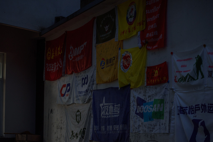到达,门口全是这种旗子。大部队已到达,断后部队最辛苦,迟了约二十分钟左右才一个个落汤鸡似的进来。店里的游客用怜悯的眼光看着我们进来,就像后面我们再用怜悯的眼光看着再后进来的人。