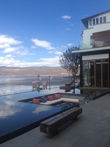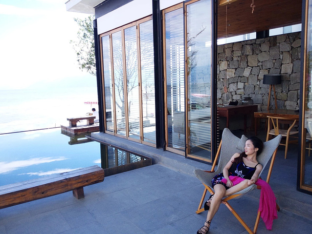 这家客栈前面设计了一个类似于储水池的台面,其实走下去是一段环海公路,再前面才是海,而这样巧妙的设计是不是有海天一线的感觉,中间的沙发是凹下去的,当你置身其中简直太!美!了!!!。。。