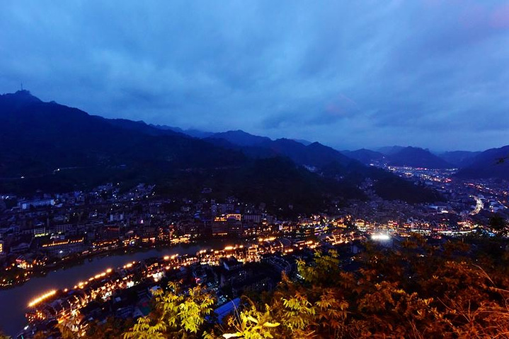 天色渐暗,河两岸的灯光亮起来了,夜色下的镇远则更是迷人。白天的镇远,清静。晚上确又是另一番风景。各种各样的灯装饰着这个小城。祝圣桥、新大桥、青龙洞都被彩灯装饰起来。镇远美,美在山和水。还有一道美景,那就是灯和光送来的夜景。一排排的红灯笼,昏暗柔和的灯光把镇远衬托得流光溢彩、婀娜多姿。