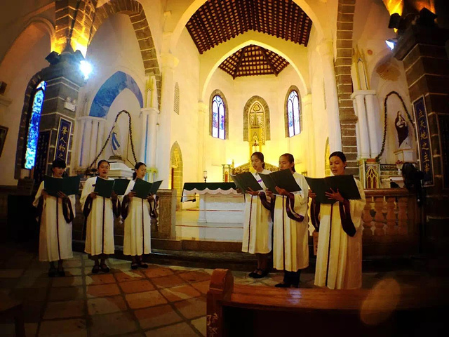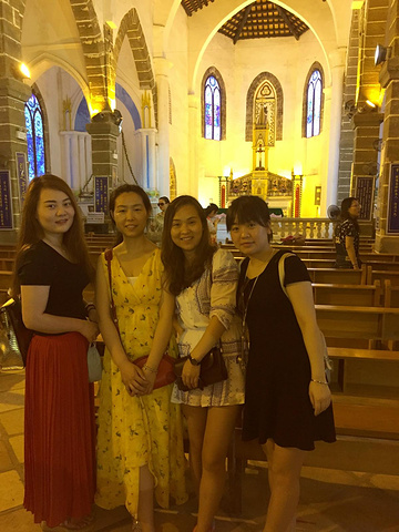 高大雄伟的天主教堂,在四周低矮民居的衬托下,显得规模庞大,颇有气势。正门顶端是钟楼,高耸着罗马式的尖塔,在周围的建筑群里显得别具一格。教堂里面庄严而安静,进入的游客说话不由得压低声音,轻声细语。我们进去不久就遇上了唱诗班的表演,表演总共6人都是统一的服装,简单的钢琴伴奏,悦耳的和声在庄严的教堂里回荡,特别好听,一天唱诗班循环表演好几场,间隔大概一个小时左右。我们刚进入教堂的时候就开始下雨了,等我们想走的时候已经下起了暴雨,索性就在教堂里避雨,所以我们看了两场和唱诗班的表演。