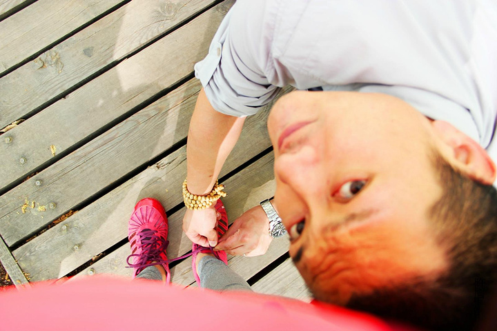 细心的男人啊,在给我系鞋带,唉,还不忘漏个练。