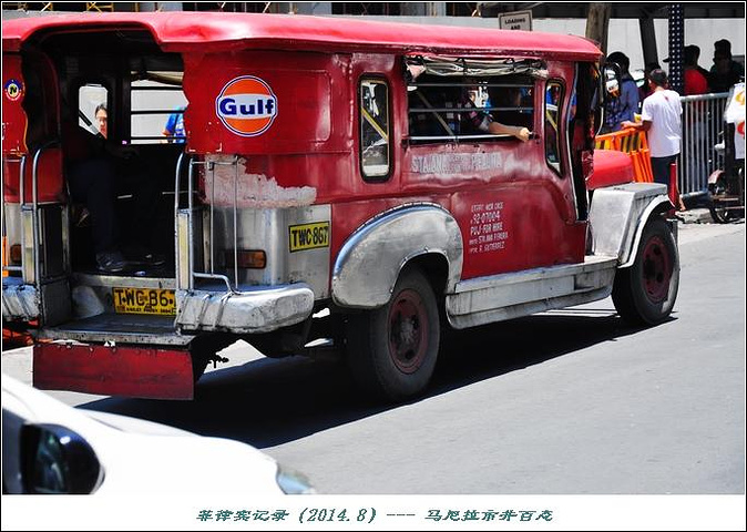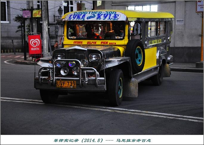 马尼拉貌似没有传统意义上的公交车,出行可以选择轻轨LRT、MRT等,打出租车,或者是一种小公交Jeepney,多数色彩鲜艳,涂装丰富。Jeepney是之前美军战时军用车改装的,依线路不同10P或8P每人;可是没有站牌,也不清楚当地人怎么知道什么车走什么线路,后来想想,可能是靠日积月累、约定俗成,久而久之也就习惯了,但是对外地人而言,短期内难以明了;我们只是最后一天实在打不到车,“赶鸭子上架”的坐了一回Jeepney。车内两排长凳,大家相对而坐;司机则一手频繁摁喇叭,一手手指夹着大量纸票操控方向盘,此情景颇为新奇,于我等也是一种别样的体验。