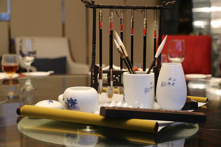 错过美妙的桑葚宴,还好没错过酒店海景厅的晚餐,中式风格的海景厅,以笔墨纸砚压阵显得文气十足,这是儒家气息的大山东的特色嘛。