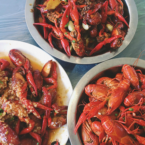 大概5点多,太阳还很辣,龙虾城吃饭的人还不是很多,但店门口一排全都是像大排档一样的桌椅,很有夏天的感觉。我们选了网上口碑还不错的味道工厂店。用团购的套餐券点了一份蒸虾、一份蒜蓉虾、一份油焖大虾,味道工厂的特色是蒜蓉虾。再加了一些特色的素菜。吃到停不下来~~~