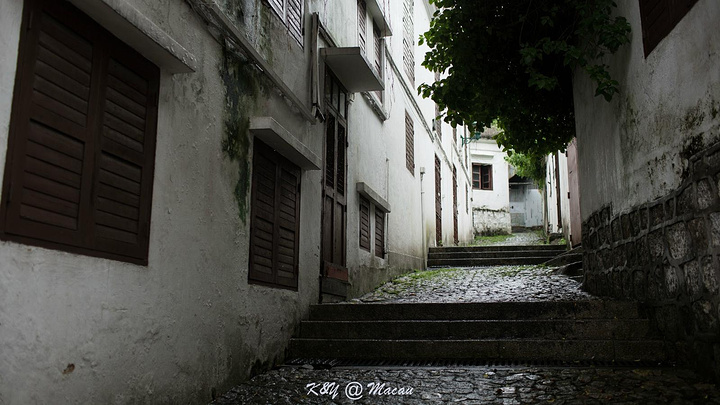岗顶前地两侧的建筑,大多是老民居住宅,狭长的街道很幽静,而行人无几.. 岗顶前地旁的岗顶剧院、圣奥斯丁教堂、圣若瑟修道院及何东图书馆,都属澳门世界文化遗产中最古老的西式建筑,是中西合璧的代表佳作。