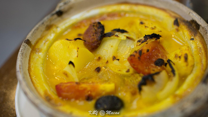 葡国鸡,看到有就顺便点了一份,无法判断是否正宗;单看外表充斥着咖喱的样貌,表层的焦应该是火枪略过,可能大厨一不留神,让火枪多停留了几秒种,翻动躲在洋葱下面的鸡肉,肉质松软但又不失弹性,一口咬下并非完全咖喱的味道,配料中的土豆黏黏糯糯,这道澳门的代表菜品真的值得一试!